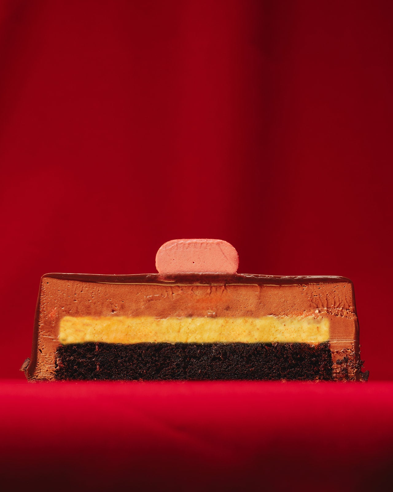 Chocolate cake, chocolate mousse, passionfruit curd, dark chocolate glaze, raspberry mousse, caramel crispy pearls